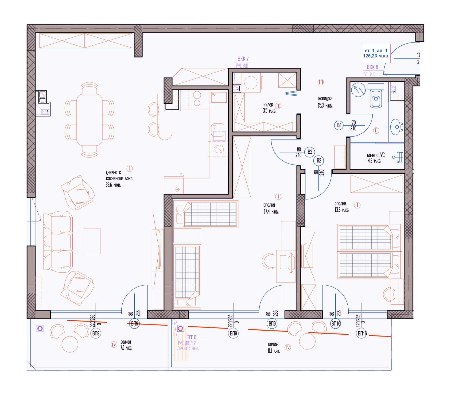 Апартамент - Дневна с кухненски бокс, две спални, баня с тоалетна, килер, коридор, два балкона