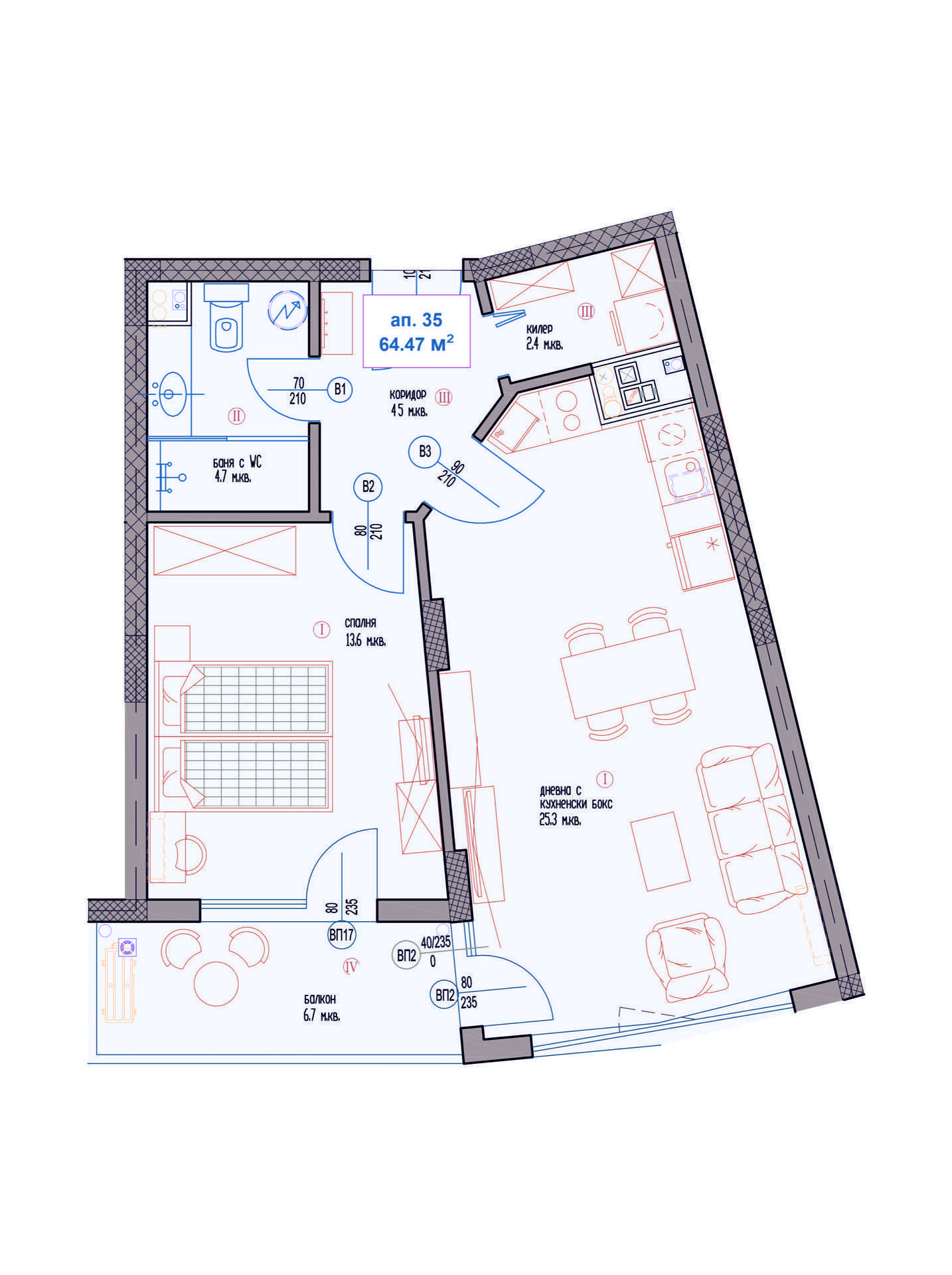 Апартамент - Дневна с кухненски бокс, спалня, баня с тоалетна, килер,коридор, балкон