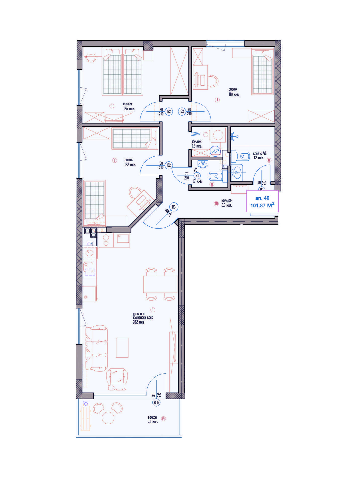 Апартамент - Дневна с кухненски бокс, три спални, баня с тоалетна, тоалетна, дрешник, коридор, балкон