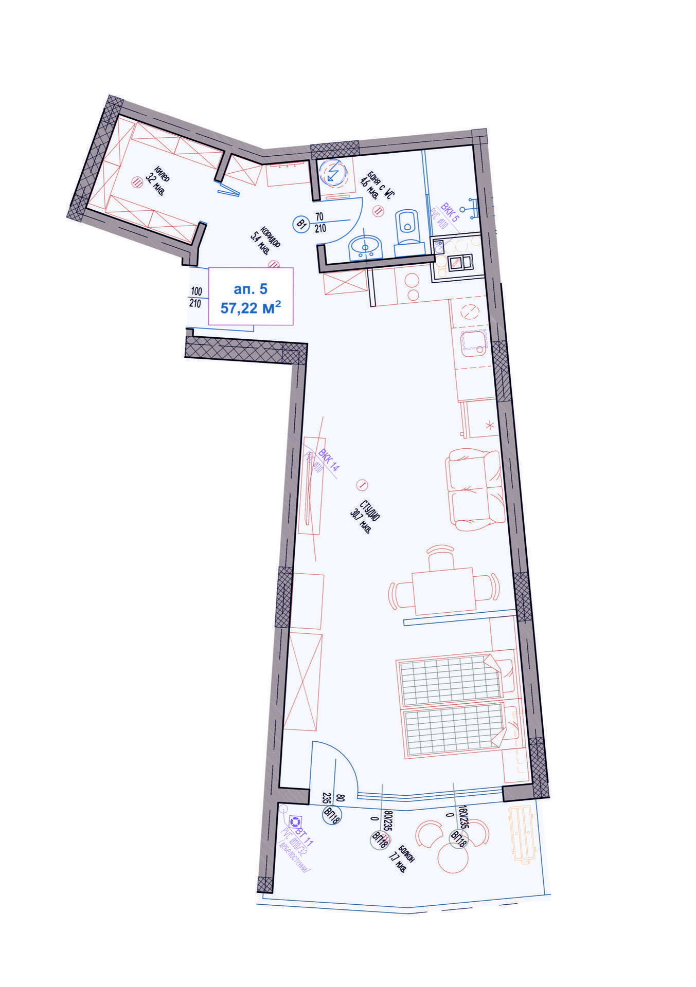 Апартамент - Дневна с кът за спане, баня с тоалетна, килер,коридор, балкон