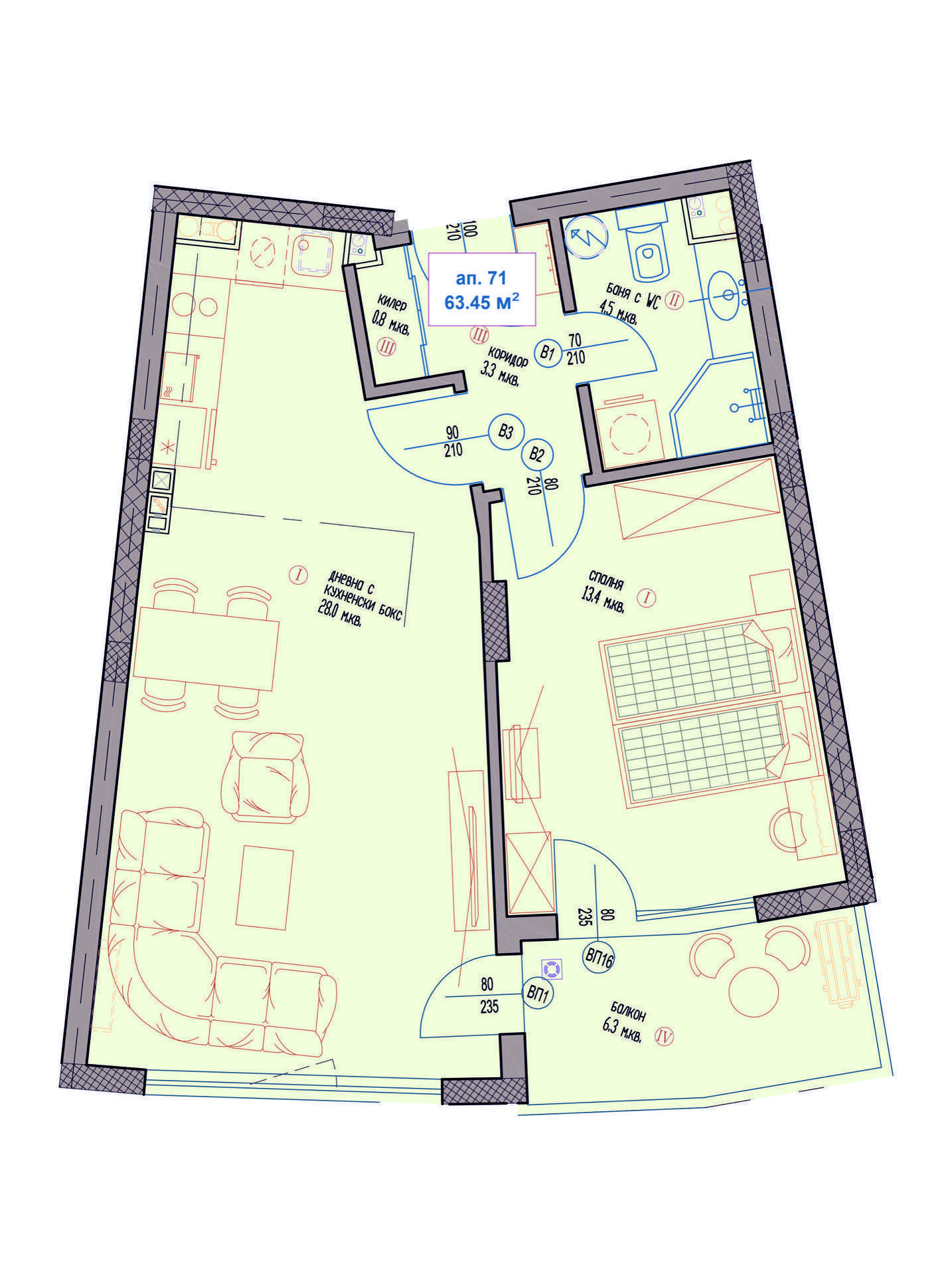 Апартамент - Дневна с кухненски бокс, спалня, баня с тоалетна, килер,коридор, балкон