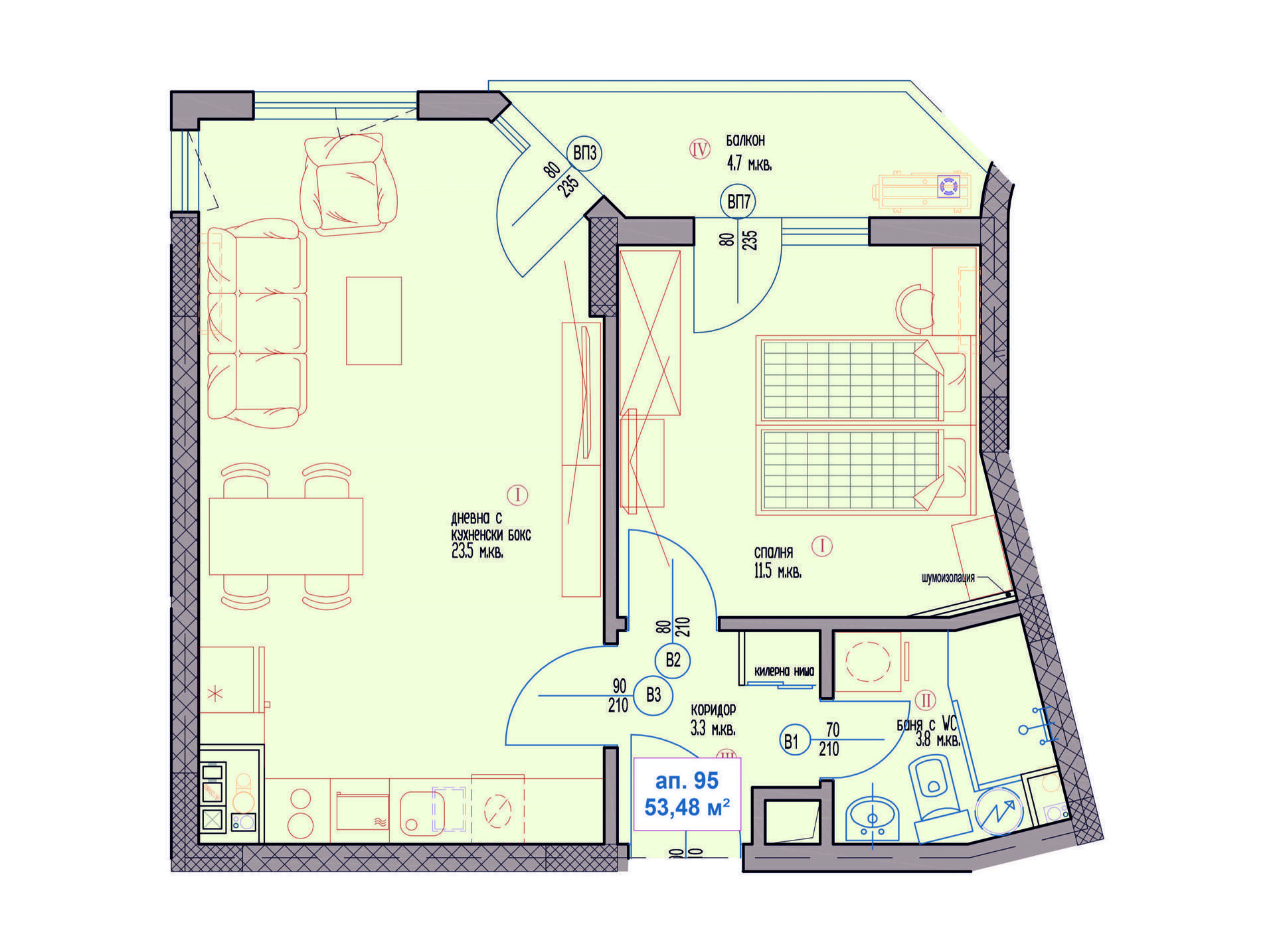Апартамент - Дневна с кухненски бокс, спалня, баня с тоалетна, килерна ниша,коридор, балкон