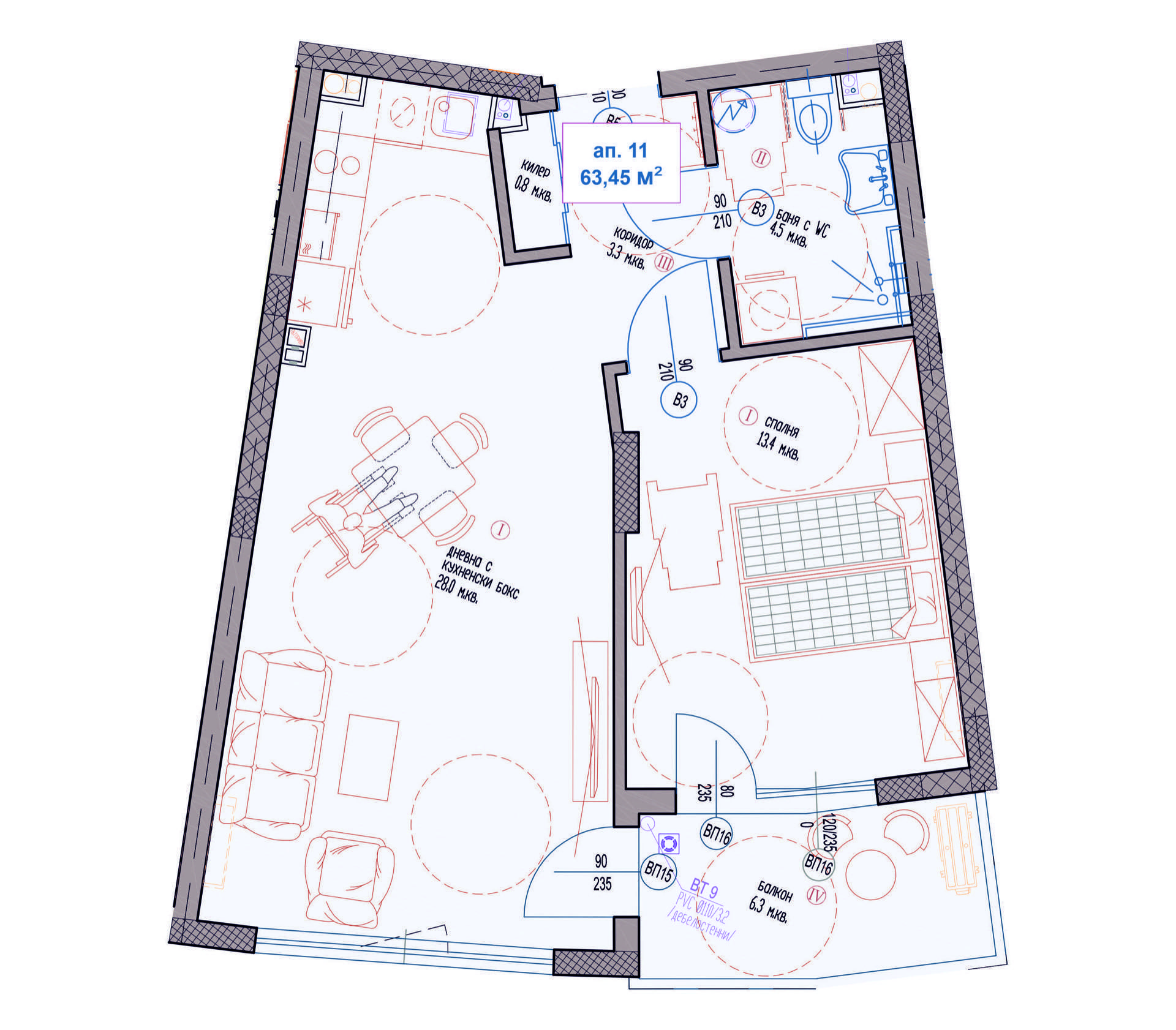 Апартамент - Дневна с кухненски бокс, спалня, баня с тоалетна, килер,коридор, балкон