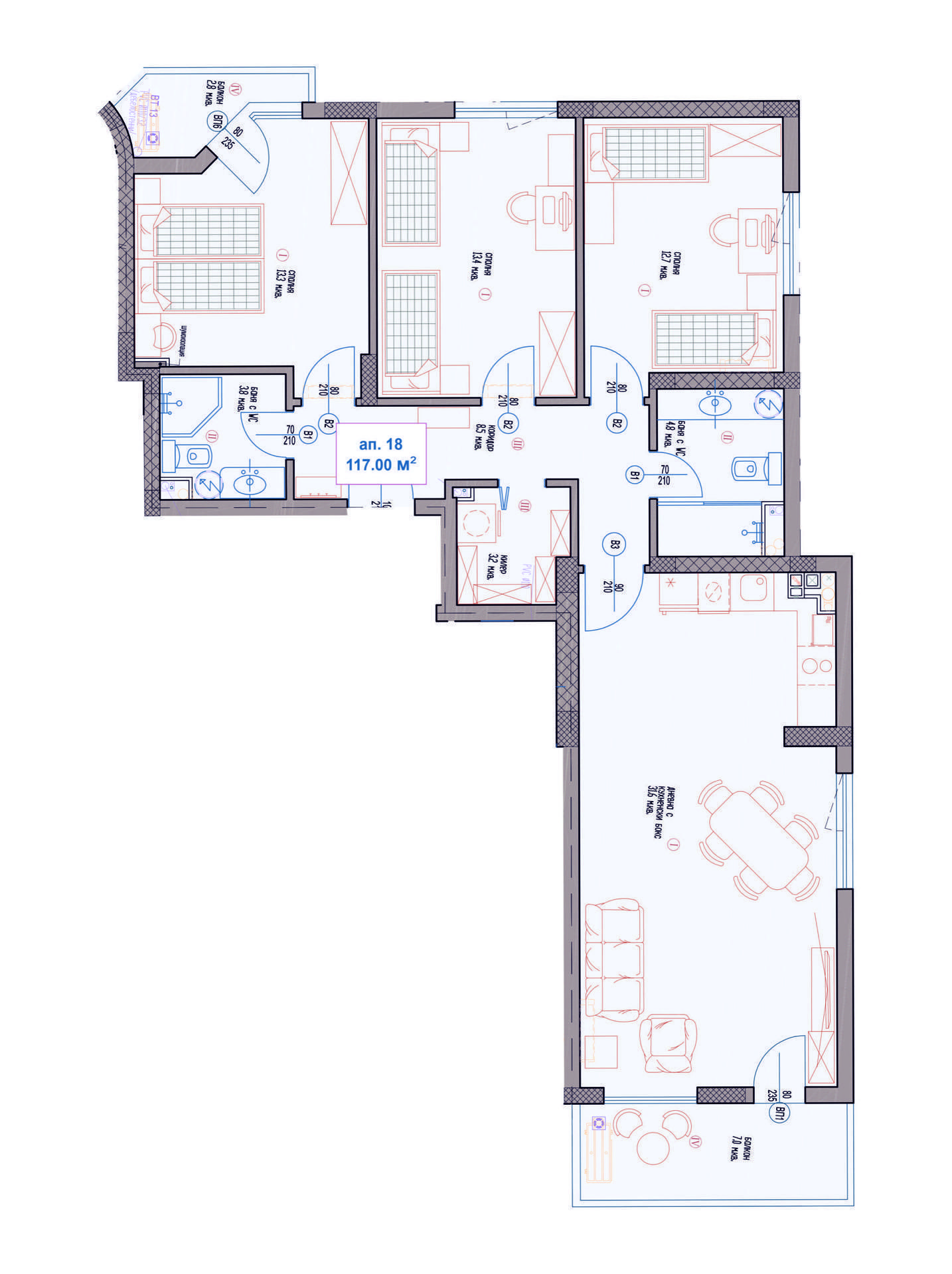 Апартамент - Дневна с кухненски бокс, три спални, баня с тоалетна,баня с тоалетна, килер,коридор, два балкона