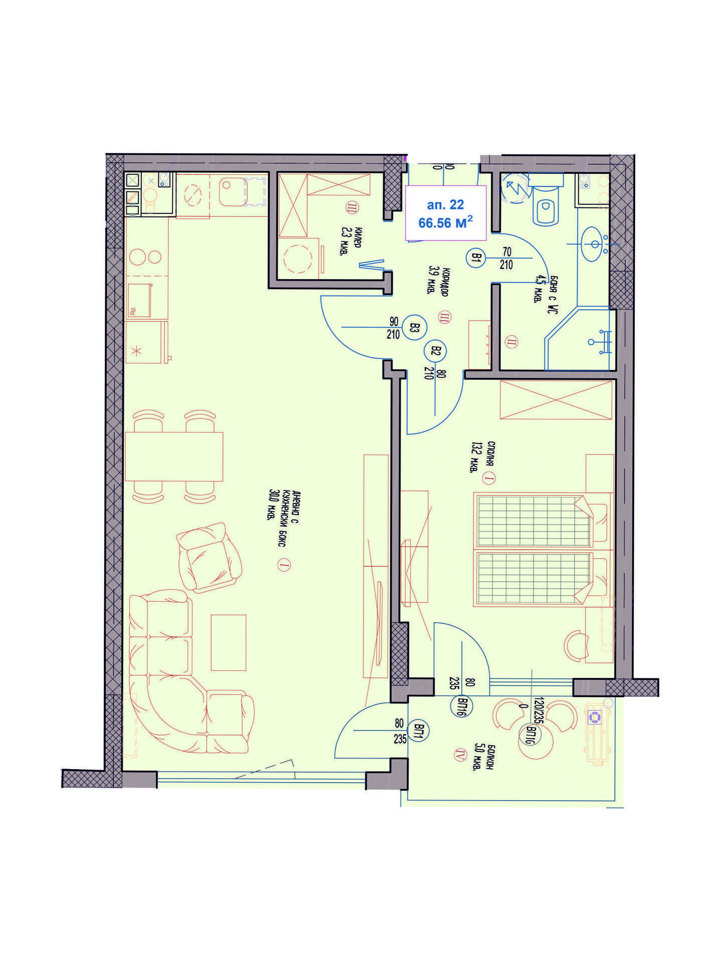 Апартамент - Дневна с кухненски бокс, спалня, баня с тоалетна, килер,коридор, балкон