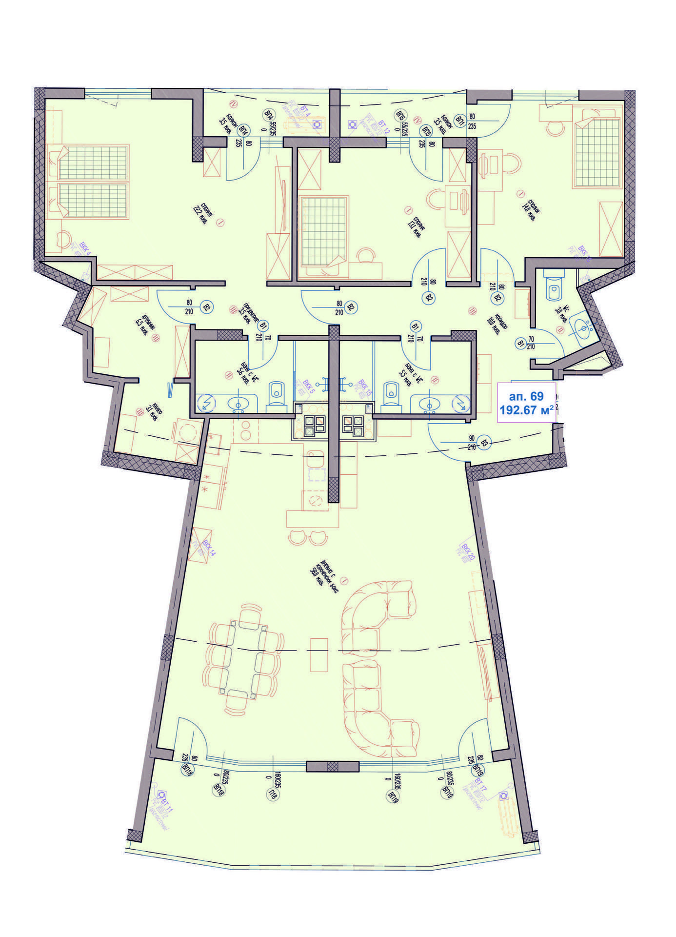 Апартамент - Дневна с кухненски бокс, три спални, баня с тоалетна, баня с тоалетна, тоалетна,дрешник,килер,коридор, три тераси